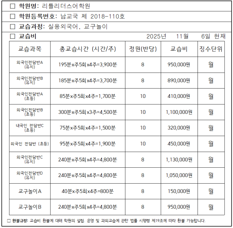 리틀리더스어학원 2026학년도 교습비안내