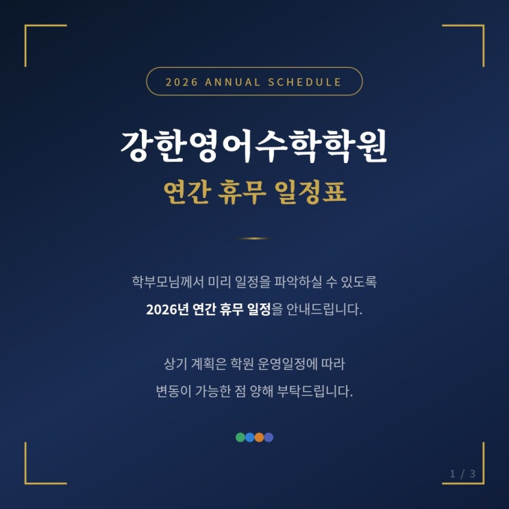 강한영어수학 1년 연중 휴무일입니다. 스케줄 잡으실때 도움되실수 있게 올해부터는 미리 안내드릴 예정입니다. 2026 한해도 더 가열차게 달려보겠습니다. 감사합니다. <img src="https://blogthumb.pstatic.net/MjAyNjAyMjRfMSAg/MDAxNzcxOTE1NzY4NjY5.SBmUrBUdwPnXmfAWbfQTGS1IWW6B49I7rtkJIgoGZtcg.dc9ROugbsbTcjrtshupVFoplv19rQePGFhuxZJ6rnFcg.JPEG/%C0%CE%BD%BA%C5%B8_1_%C7%A5%C1%F6_%281%29.jpg?type=s3" />