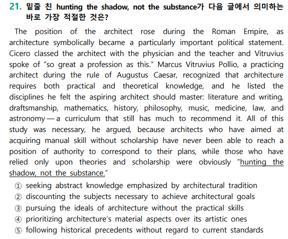 어차피 절대평가인데 조금만 해도 괜찮지 않을까? 2등급 정도는 조금만 해도 받을 수 있지 않을까? 2025년 수능에 출제된 21번 문항입니다. 로마시대의 건축가의 지위는 상승했고 위대한 직업으로 여겨졌으며, 당시 건축은 이론적인 지식과 실용적인 지식을 고루 필요로 하는 학문이었다는 내용이었습니다. 이론과 학문에만 의존하면 실체가 아닌 그림자만을 쫓는 것이다. 라는 문장의 함축적의미를 찾는 지문이었습니다. 수능 시험장에서 해당 지문을 읽고 푸는데에 주어지는 시간은 많아야 2~3분입니다. 최근 영어 모의고사 및 수능에서는 영어 단어만 많이 외우고, 문장 해석만 해서는 풀 수 없는 문제가 많아지고 있습니다. 지문의 주제는 다....... <img src="https://blogthumb.pstatic.net/MjAyNjAyMTNfNDUg/MDAxNzcwOTEyNTI4MDA3.ILjiokhpg6SLGD2Ws8taZzEUXlC-mTORrypEl3H3JWgg.BH7ebDsnO7YW5Y46mh3BpgPK9XEIdIJMw1_h8d9zU60g.PNG/image.png?type=s3" />