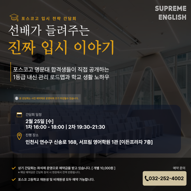 안녕하세요! 서프림고등영어 입니다:) 포스코고 12기 학생 여러분! 모두 합격을 축하합니다. ▼포스코고 간담회 신청하기▼ 포스코고 합격을 앞둔 신입생들은 대체로 비슷한 고민을 안고 입학을 준비합니다. “입학 전까지 어떻게 준비해야 할까?” “중학교 때의 학습 방식으로도 충분할까?” 그러나 실제로는 입학 직후인 3월의 학습 선택이 고교 3년의 내신 흐름에 큰 영향을 미치는 경우가 많습니다. 서프림영어학원은 이 시기의 중요성에 주목해 본 간담회를 기획하게 되었습니다. 이 간담회는 포스코고를 실제로 졸업한 선배들이 신입생 시절 직접 겪었던 경험을 바탕으로, 입학 전에 반드시 알고 있었어야 할 내용을 공유하는 자리입니다....... <img src="https://blogthumb.pstatic.net/MjAyNjAxMjNfMTYz/MDAxNzY5MTc0MTA5OTg4.Qml2A-tyyyWb0UU0fUDttYyB5Hy7sQlR67Q2s7-Dq5sg.0HPN5IG1o8CEO_sJtGm07ZQ527d34-JTV5CNnVCSkBQg.PNG/%B0%A3%B4%E3%C8%B8_%C0%CC%B9%CC%C1%F6.png?type=s3" />
