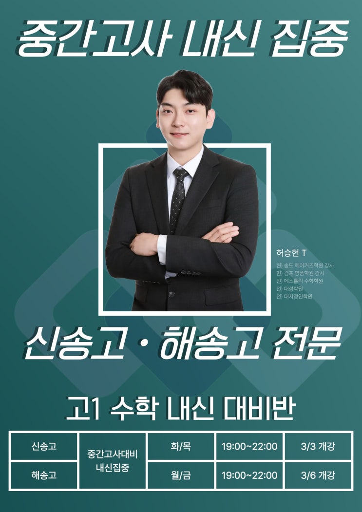 <신송고,해송고> 내신 수학 대비반 허승현T 신송고 내신은 기출과 스킬! 해송고 내신은 기출난이도에 따른 폭넓은 대비! ▶시간표 신송고 (화/목 Pm 7:00 ~ 10:00) 해송고 (월/금 Pm 7:00 ~ 10:00) ▶ 대상 : 고 1 (신송고,해송고) 수강 신청 및 문의 ☎032.859.8800 ▶ 강사 : 허승현 T [허승현T의 신송고 내신 대비 방향] [허승현T의 해송고 내신 대비 방향] 실제 해송고 시험대비가 타학교에 비하여 더욱 힘들 것입니다. 모의고사 기출, 교과서 문제, 시중교재에서의 응용문제 등 여러 가지를 복합적으로 준비해야 하기 때문에 더 많은 시간과 노력을 기울여야 합니다. [허승현T의 내신 학습 관리법] 수강 신청 및 문의 ☎032.859.8800 <img src="https://blogthumb.pstatic.net/MjAyNjAyMDZfMjM2/MDAxNzcwMzc2MjM0Nzc1.I645iA5yZo6GjVnNrvKKLceawoDc1WARWOwBMda7E-og.wM1Z_tjA8H11nl6-ejs7C5KYhrxh5hd2ZDjxj6ofvr0g.JPEG/%C1%A6%B8%F1%C0%BB_%C0%D4%B7%C2%C7%D8%C1%D6%BC%BC%BF%E4._%286%29.jpg?type=s3" />