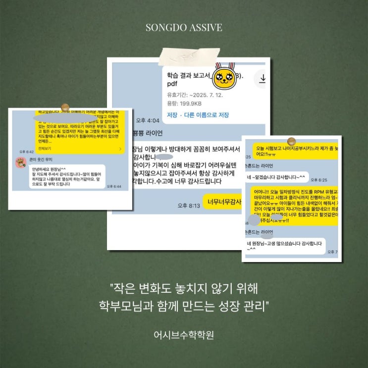 안녕하세요, 어시브수학학원 송도점 원장입니다 오늘은 학원 안에서 아이들을 어떤 방식으로 관리하고 있는지에 대해 말씀드려보려고 합니다! 아이들이 수업을 잘 따라오고 있는지, 배운 내용을 정확히 이해하고 있는지 궁금해하신 적 있으시죠? 어시브수학학원은 매주 주간평가를 통해 아이의 학습 현황을 학부모님께 직접 공유하고 있습니다. 저희 학원의 주간평가는 단순한 성적 전달이 아닌, 한 주 동안의 수업 태도, 이해 수준, 과제 수행 여부를 종합한 내용을 보내드리고 있습니다! 아이들의 학습은 조금씩이라도 꾸준히 관리하는 과정이 가장 중요하다고 생각합니다. 그래서 저희는 월 1회가 아닌, 매주 주간평가를 작성하여 아이의....... <img src="https://blogthumb.pstatic.net/MjAyNjAyMDhfNjYg/MDAxNzcwNTExMzkxMTE0.MLZDmdzkWZjU5tv8rXqGZP1nhSOclHv-X9ElsKbTEPAg.qzqrC8nlG781CXhMJl0uwly1765YLAh2xTM7cVH-21wg.JPEG/%C1%A6%B8%F1%C0%BB_%C0%D4%B7%C2%C7%D8%C1%D6%BC%BC%BF%E4._%281%29.jpg?type=s3" />