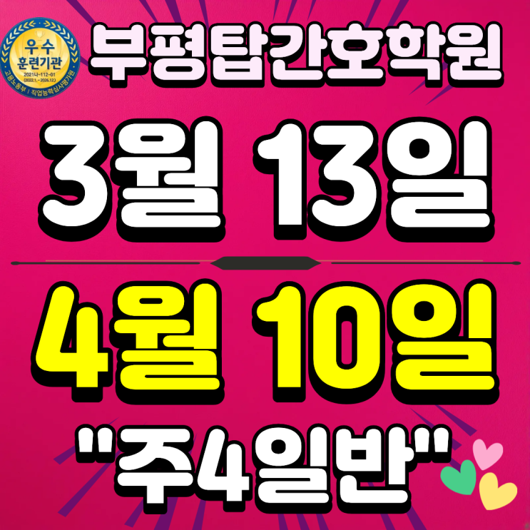 26년 봄학기 선착순 모집중!! "주4일반" ♥1차개강 - 26년 3월 13일 ♥2차개강 - 26년 4월 10일 안녕하세요~ 인천간호학원부평탑간호학원입니다^^ 추운 겨울이지만 울 부평탑 학생들의 분위기는 2개월남짓 남은 국가고시대비반의 열공과 병원실습반의 병원에서의 실기수업 등 열기가 후끈하답니다!! 25년 12월 31일 개강한 속성반 신입생들은 새학기 맞이로 초롱초롱 열공 분위기!!^^ 각자의 자리에서 열심히 학업에 열중하고 있는 울 학생들의 모습이 넘 멋지답니다! 여러분도 26년 새해를 맞이하여 그동안 고민하시던 여러분의 목표, 꿈을 향해 도전하는 2026년이 되실길 바래요^^ 인천간호학원부평탑간호학원 26년 봄학기 신입생 모....... <img src="https://blogthumb.pstatic.net/MjAyNjAxMDFfMTg0/MDAxNzY3MjczODc0MzYz.s2c6o3nCmD1GhkTIy6KNIf2bVRQod7udM-kL1BqmZSAg.XO0N6irThtVXXv4P_IY_Q-O0JjIOt8i4Wzv0jFrp_Ugg.PNG/1.png?type=s3" />
