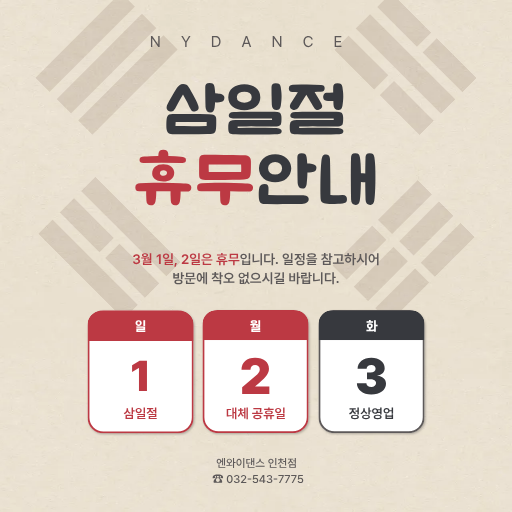 엔와이댄스 인천점 3월 휴무 안내 안녕하세요 엔와이댄스 인천점입니다:) 3월 공휴일 일정에 따라 학원 휴무일을 안내드립니다. 3월 1일(일) – 삼일절 휴무 3월 2일(월) – 대체 공휴일 휴무 3월 3일(화) – 정상 영업 위 일정 참고하시어 수업 참여 및 방문에 착오 없으시길 바랍니다. 수업 스케줄 관련 문의는 언제든지 연락 주세요 ☎ 032-543-7775 항상 엔와이댄스를 찾아주셔서 감사합니다. 즐거운 연휴 보내세요✨ <img src="https://blogthumb.pstatic.net/MjAyNjAyMjZfMTYy/MDAxNzcyMDg5OTMxODYw._OO7crPZcjCx875hAciVAKjPwrdsh8c4_5jmw-jnzMog.6EPymbNYWjpvs1ExNFS6y-KI3Dstn_dk_B7xf5J4IGIg.PNG/image.png?type=s3" />