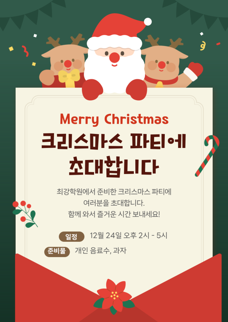 초등부 크리스마스 파티 안내 12월 24일 | 초등 1~6학년 연말이 되면 아이들 마음이 유난히 설레는 계절이 찾아옵니다 올 한 해 열심히 노력해 준 초등 1~6학년 친구들을 위해 따뜻한 크리스마스 파티를 준비했습니다. 특히 6학년 친구들에게는 이번 크리스마스가 초등학교 생활의 마지막 추억이 되는 만큼 더 의미 있는 시간이 되길 바라는 마음을 담았습니다. 공부만 하는 학원이 아니라, 아이들이 웃고 즐기며 좋은 기억을 하나 더 쌓아가는 공간이 되도록 정성껏 준비하고 있습니다. 크리스마스 분위기의 즐거운 활동 학년별로 함께하는 따뜻한 시간 소소하지만 마음이 담긴 선물 아이들에게 남는 것은 성적표....... <img src="https://blogthumb.pstatic.net/MjAyNTEyMjBfMjUg/MDAxNzY2MTU3NDgzNTAz.f4lv_Sc3Vp43s44WIE91k__xV47HO7Nk-B6Zt3JdkDAg.L9sOvrHRZFZVhwNBzDJx4D7iiPSKN-A9zz17qvhkPi4g.PNG/%C1%A6%B8%F1%C0%BB%A3%AD%C0%D4%B7%C2%C7%D8%C1%D6%BC%BC%BF%E4%A3%DF%A3%AD001%A3%A8224%A3%A9.png?type=s3" />