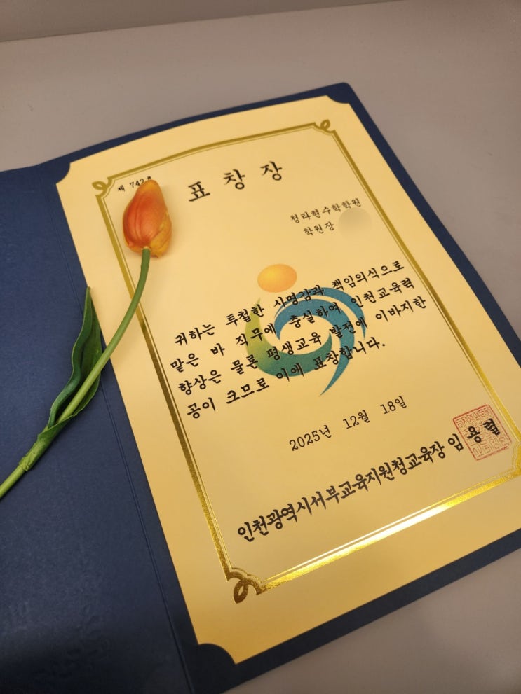 안녕하세요 3단지, 5단지 수학전문학원 현수학학원입니다. 2025년을 마무리하며 정말 기쁜 소식을 가지고 왔습니다^^ 인천광역시 서부교육지원청에서 표창장을 받게 되었습니다~ 학생들과 학부모님들께서 믿어주시는 마음에 보답하기 위해 묵묵히, 꼼꼼히 운영했는데 이렇게 의미있는 상을 그동안 노력한 일들을 알아봐주시고 의미있는 상을 받게되어 정말 기쁩니다^^ 평소 교육청 및 교육지원청의 새로운 규정이나 지침을 빠르게 확인하고, 학원 운영에 도입하여 학부모님들에게 보다 투명한 교육환경을 드리기 위해 노력했는데 이렇게 큰 상을 주셔서 감사드립니다^^ 앞으로도 귀한 아이들을 맡겨주시는 믿음에 보답드릴 수 있도록 더 투명하고....... <img src="https://blogthumb.pstatic.net/MjAyNTEyMzFfMjEx/MDAxNzY3MTcwNjM5ODA5.m-SG0CFwBZdM3hx8kRRzoIDvm4Fw868gKfkI38a2Wj0g.eXQJBJBrbDznue-N3ZOy3ZINWUaW2rK-tKZLQo_sDoog.JPEG/KakaoTalk_20251230_185715124.jpg?type=s3" />