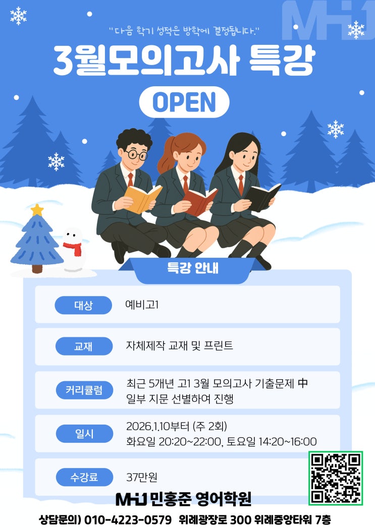 네이버폼 신청: https://naver.me/F0AW1vL6 안녕하세요, 위례 입시 영어의 중심 민홍준영어학원입니다. 다음주부터 예비고1 학생들을 대상으로 2026년 3월 모의고사 대비를 위한 특강을 개설할 예정입니다. 특강에 관한 안내는 아래와 같습니다. -대상: 예비고1 (특강 개설 위한 최소 모집인원: 5명) -교재: 자체제작 교재 및 프린트 -커리큘럼: 최근 5개년(2025년~2021년) 고1 3월 모의고사 기출문제 中 일부 지문 선별하여 진행 -일시: 2026년 1월 10일부터 (주2회) 화요일 20시 20분~22시(100분) 토요일 14시 20분~16시(100분) (수업 요일 및 시간은 모집된 인원들의 스케쥴에 따라 추후 조정될 수 있음을 알려드립니다.) -수강료: 37만원 수....... <img src="https://blogthumb.pstatic.net/MjAyNjAxMDJfODQg/MDAxNzY3MzYwNDgzOTMw.iOuwWPkyXV8qRLRfT1VGdMwkT9F7vGU8JTRd86L1eTAg.K9skWYHH-N8mfHXucpzuCCkJnK5VNLbfBKk85QRznx0g.JPEG/%C0%A7%B7%CA-%B0%DC%BF%EF%C6%AF%B0%AD-%BC%D2%B0%B3%C1%F6-001_%283%29.jpg?type=s3" />