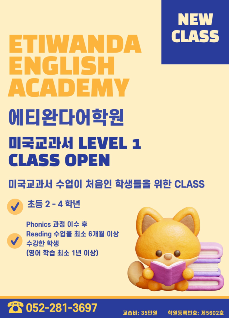 안녕하세요. 울산 에티완다어학원 송정 Campus 입니다. 저희 에티완다어학원의 미국교과서 Class에 꾸준한 관심과 문의를 보내주시는 모든 학부모님께 감사드립니다. 2026학년도를 맞아 새로운 미국교과서 LEVEL 1 Class가 개강될 예정입니다. 이 Class는 미국교과서 수업을 처음 시작하는 학생들이 기초부터 탄탄하게 실력을 쌓을 수 있도록 구성된 수업입니다. 대상: ✅ 초등 2-4학년 ✅ Phonics 과정 이수 후 Reading 수업을 최소 6개월 이상 수강한 학생 (영어 학습이 최소 1년 이상) ✅ 입학 희망 학생이 입학 조건에 해당하더라도 저희 에티완다어학원의 내원 상담과 입학시험 (Admission Test)을 통해 최종 입학 여부가 결정됩니다. ✅ 저....... <img src="https://blogthumb.pstatic.net/MjAyNjAxMDlfMjMz/MDAxNzY3ODkwMDYyODY3.S-Sf4PnnuE1a0zaPZnofGrVZ0xZbpIhYI2JmKkxz6u4g.ajZ2B8SgihksktaBGiFKMVI79jEZOwKYsL5aPpESiqgg.PNG/2026_Flyer.png?type=s3" />