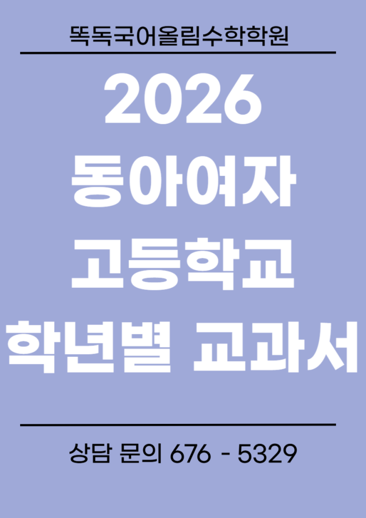 안녕하세요, 똑독국어학원장입니다. 배정 발표 후 동아여고 신입생들과 학부모님들의 설렘과 걱정이 동시에 느껴지는 요즘입니다. 오늘은 동아여고 공부의 시작인 학년별 사용 교과서 목록과 함께, 방대한 범위를 자랑하는 동아여고 시험에서 살아남는 원장만의 특급 전략을 공개합니다. 2026 동아여자고등학교 학년별 교과서 현황 http://donga.gen.hs.kr/xboard/board.php?mode=view&number=12295&tbnum=35&sCat=0&page=1&keyset=&searchword= 동아여고 출제 경향 1. "평이한 난이도, 하지만 숨 막히는 범위" 동아여고 문제는 아주 꼬아 놓은 킬러 문항보다는....... <img src="https://blogthumb.pstatic.net/MjAyNjAyMThfOSAg/MDAxNzcxNDIyMDMxNTEw.xmdGZzeRQJT9rofYdnXPEKvpsFpqiYFgoBnDAYXObLIg.ZftrGuk1hRYGwpS5EjcW3A2BpsVHDuG9ENDkkzRJ1Hcg.PNG/%C1%A6%B8%F1%C0%BB_%C0%D4%B7%C2%C7%D8%C1%D6%BC%BC%BF%E4_-001_%2824%29.png?type=s3" />