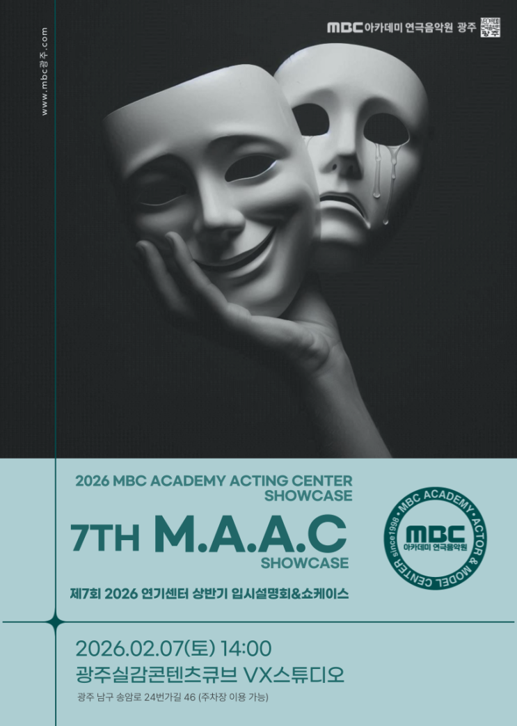 안녕하세요 :) 광주연기학원 MBC아카데미 연극음악원 입니다! 본원의 겨울 방학 10 to 10 프로그램을 마치기 전 02/07 상반기 쇼케이스를 진행했는데요 26입시반, 예비입시반, 틴스타반, 주말반 아이들의 성장과정을 부모님과 지인들을 초대하여 보여줄 수 있는 아주 뜻깊은 시간이었습니다! 이번 쇼케이스도 1, 2부로 나눠져 1부 - 입시설명회 및 예비입시반, 틴스타반, 주말반 작품 발표 2부 - 26입시반 작품 발표로 진행되었습니다 본원에 소중한 자녀들을 믿고 맏겨주신 부모님들께 입시설명회를 시작으로 2026 상반기 쇼케이스 막을 올렸습니다 먼저, 1부는 주말반, 틴스타반, 예비입시반 아이들이 연기, 뮤지컬, 무용 순서대로 무대에 올랐....... <img src="https://blogthumb.pstatic.net/MjAyNjAyMjBfMjQz/MDAxNzcxNTg4OTkyMDk3.JPbhL_FsS0dnHqgSVYaJVGEuzQ9h_3K_KvR4qNA47Ekg.9Sd_jzt4UUuKFYipl0akqSseI5zPKiej4dSvEJlNQFMg.PNG/KakaoTalk_20260220_210222565.png?type=s3" />