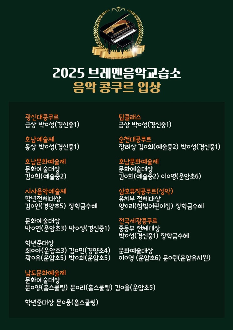 2025 브레멘음악교습소 음악콩쿠르 입상내역