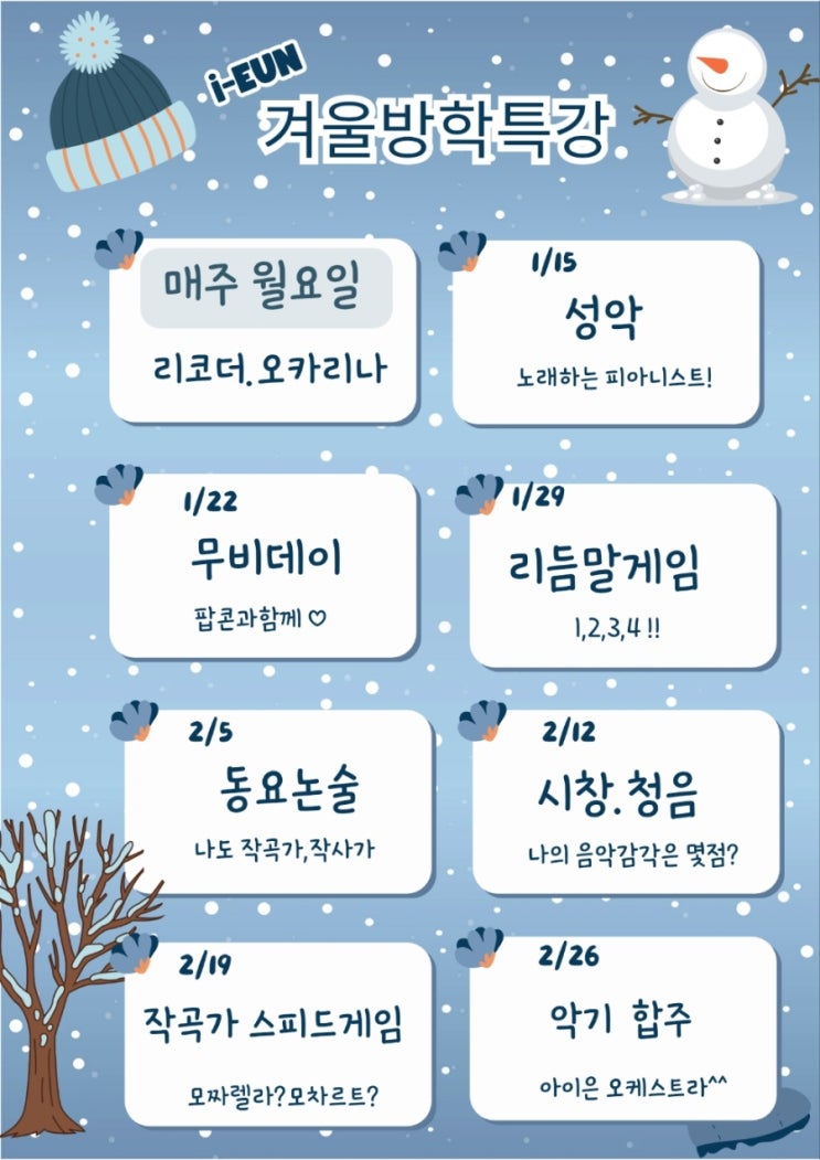 ♡ 아이은 겨울방학 특강 안내 ♡ 겨울방학 동안 아이들이 음악을 더 즐겁게, 더 넓게 경험할 수 있는 시간을 준비했어요 매주 월요일은 학교연계수업으로 부는악기인 리코더 오카리나 단소 그리고 매주 목요일 예술융합특강! 이번 겨울 방학 특강으로는 연주 · 감상 · 리듬 · 작곡까지 자연스럽게 음악 감각을 키워봅니다. 겨울방학 특강 일정 ✔️ 매주 월요일 리코더 · 오카리나 수업 ✔️ 매주 목요일 ✔️ 1/15 성악 노래하는 피아니스트! ✔️ 1/22 무비데이 팝콘과 함께하는 영화 감상 ✔️ 1/29 리듬 말게임 1, 2, 3, 4!! ✔️ 2/5 동요 논술 나도 작곡가, 작사가 ✔️ 2/12 시창 · 청음 나의 음악 감각은 몇 점? ✔️ 2/....... <img src="https://blogthumb.pstatic.net/MjAyNjAxMDdfMTI3/MDAxNzY3NzU0NzYzOTUw.qHCQsatq6TWmMlJliZyTfN8rwxa-GmnSYq9mpqXO2Bkg.Wkws0k5R15xh1Y1lsxCc6m6PMeV5BrQbR0ObLTaF77Ag.JPEG/900%A3%DF1767754040079.jpg?type=s3" />