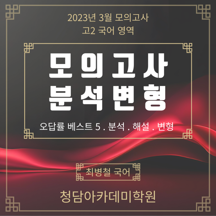 일곡동 국어학원, 매곡동 국어학원, 청담아카데미학원, 최병철 국어입니다. 고등학교 국어 내신 시험 대비에 도움이 되고자 2023년 3월 고2 국어 모의고사(전국연합학력평가) 오답률 베스트 5 해설과 문제풀이 및 변형문제를 올립니다. 붉은색과 파란색 글씨는 필자의 해석입니다. 문제 풀이는 오답률 베스트 순서대로 배열했습니다. 1단계에 해설과 문제 풀이가 있으며, 2단계에 변형문제가 있습니다. (2단계 변형 문제는 1월 12일에 올리겠습니다.) EBS를 먼저 할용하시고 그래도 잘 이해가 안 되거나 약간 다른 접근이 필요한 학생에게 필자의 해석을 참고하시기를 추천합니다. 청담아카데미학원 수강생에게는 수능 . 모의고사 기출 문제(2020....... <img src="https://blogthumb.pstatic.net/MjAyNjAxMDhfMTYx/MDAxNzY3ODM5NzM2MjA5.dNnwo4UmvW22Z2YH-wdQoqm34ql8pero-9U033c0Xk4g.VIprwRPWgUHhqUvG9GthIOUI4fdxS59AKhEJ_0ZEEncg.PNG/%B8%F0%C0%C7%B0%ED%BB%E7-001.png?type=s3" />