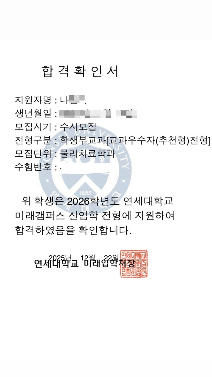 우리 나@서가 드디어 본인이 그렇게 가고 싶어 했던! 연세대학교 물리치료학과에 합격을 했습니다. 중3 때 부터 꾸준히 가르쳤던 녀석입니다. 너무너무 기쁘네요^^ 내년에는 더 좋은 결과들이 나올 것이라고 확신합니다! 이제 고등수학은 연제렉스학원 입니다! <img src="https://blogthumb.pstatic.net/MjAyNTEyMjJfMjIy/MDAxNzY2MzkzNDQzMDU5.ATA85_0Zk2fqYPHyGIxUlGBadQAd1CUZDvF2bWkxQ24g.pe7Zsio7zBFtq1Skp2jWiF06VlXDlSXlGDS3karpjfMg.JPEG/KakaoTalk_20251222_105854147.jpg?type=s3" />