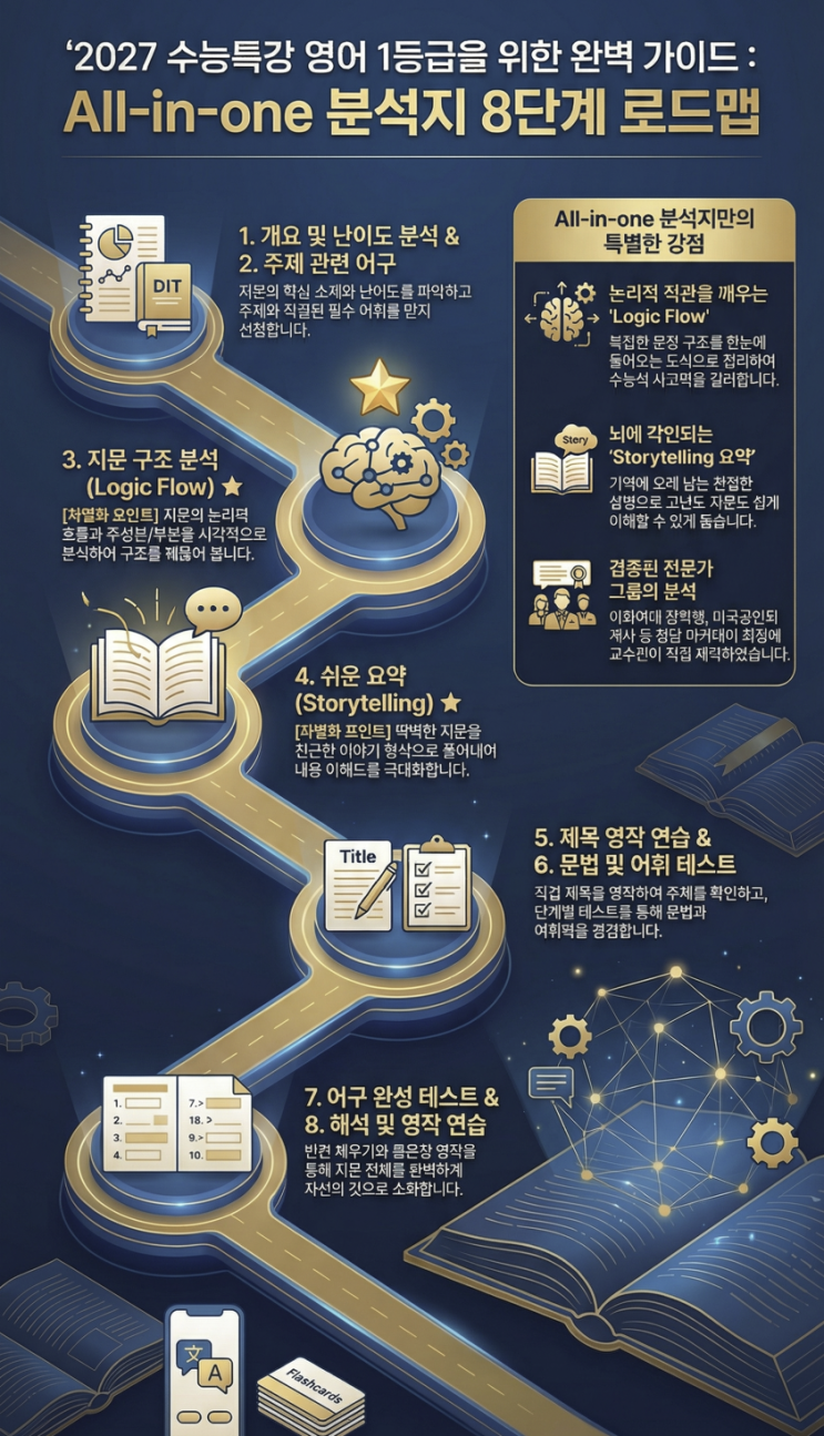 2027 수능 특강 영어 1등급을 위한 All-in-one 분석지 8단계 로드맵으로 지문 완벽 마스터 수능 영어에서 성적을 가르는 건 “단어를 얼마나 아느냐”만이 아닙니다. 지문을 어떻게 읽고(구조), 무엇을 남기고(핵심), 어떻게 검증하고(문제/영작), 내 것으로 소화하느냐(재구성)가 실전 점수를 결정합니다. 그래서 준비했습니다. All-in-one 분석지 8단계 로드맵은 ‘읽기 → 해부 → 요약 → 적용 → 내재화’까지 한 번에 끝내는 체계적 시스템입니다. 단순히 해설을 보는 방식이 아니라, 지문을 “분석 가능한 형태”로 바꿔서 어떤 지문이든 스스로 풀 수 있게 만드는 훈련이에요. All-in-one 분석지 8단계 한눈에 보기 Step 1. 개요 파악: 지....... <img src="https://blogthumb.pstatic.net/MjAyNjAyMjFfMjcg/MDAxNzcxNjYzMDk2MTIx.huhyJMP1D5Hggm4hFQUKRnEnedr1qd-EcptWGOS-euEg._2IW0bNmtng93AjRl6vDJbm4cz79XMD4KAKnjZF8Ojgg.PNG/1.png?type=s3" />