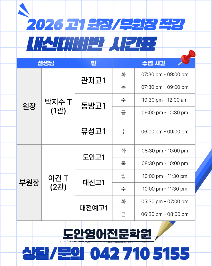 3월이 코앞으로 왔습니다. 이제 우리 아이들이 진짜 고등학교를 입학하게 되네요. 시작은, 내신대비는, 그리고 수능대비도, 바로 도안영어가 답입니다. 최고의 강의와 관리로 만나요. <img src="https://blogthumb.pstatic.net/MjAyNjAyMjZfMTY0/MDAxNzcyMDkxODIwMTQ2.jPYnmkbpofUwzrlYe77c5aFQ03QBRfBu9hMuusrjOrQg.8GvIdSshqTAvI7KUPFegcDFE2ejTedaRvUnz2U6Ypzgg.PNG/IMG_0475.png?type=s3" />