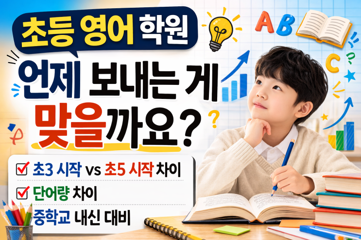 초등 영어 학원 언제 보내는 게 맞을까요? 요즘 학부모 상담을 하다 보면 가장 많이 듣는 질문이 있습니다. 바로 “초등 영어 학원은 언제부터 보내는 게 좋을까요?” 입니다. 초등 1~2학년부터 보내야 할지, 아니면 초3 정도부터 시작하면 되는지, 혹은 초5쯤 보내도 괜찮은지 고민하는 부모님들이 정말 많습니다. 결론부터 말씀드리면 시작 시기에 따라 영어 실력의 차이는 꽤 크게 벌어질 수 있습니다. 특히 단어량과 중학교 내신 적응력에서 그 차이가 분명히 나타납니다. 오늘은 ✔ 초3 시작 vs 초5 시작의 차이 ✔ 단어량 차이 ✔ 중학교 내신 대비 관점 이 세 가지 기준으로 자세히 설명드리겠습니다. 초3 시작 vs 초5 시작 차이....... <img src="https://blogthumb.pstatic.net/MjAyNjAzMTZfMTgx/MDAxNzczNjcyOTUyMDgx.-620peqHffw2-BlLqp4Wcmrkv1emeI7aUfLKY1GPcpog.QdKnROG_9D9E7f7qN7ugMLtXhr26aiaexV3ssUmFdPsg.PNG/KakaoTalk_20260316_235527647.png?type=s3" />