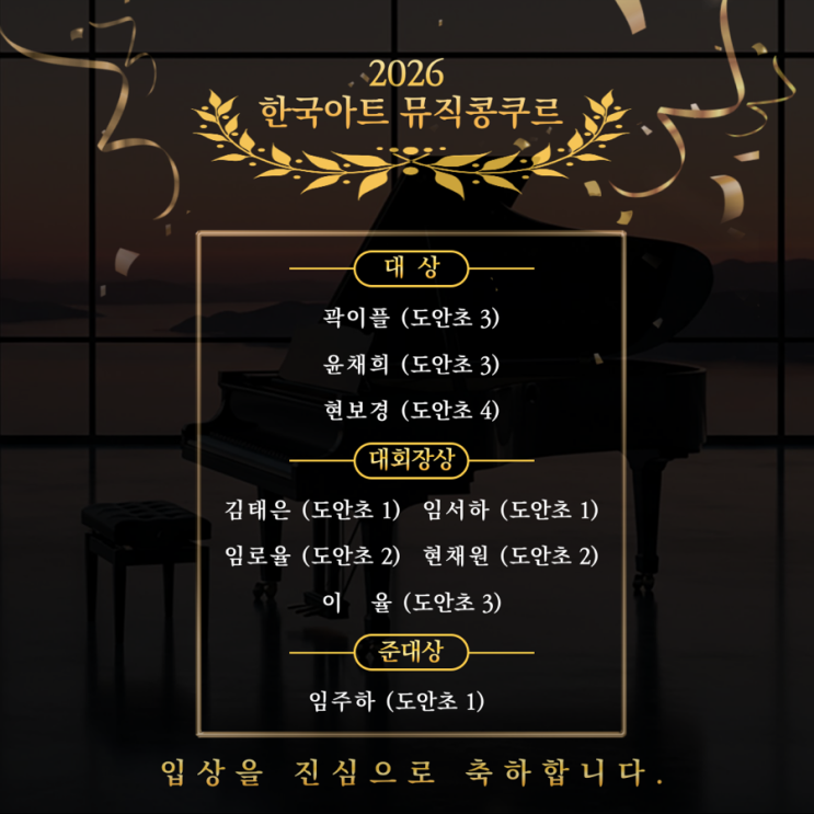 안녕하세요 대전 도안동 더소울피아노 입니다 벌써 작년이 되었네요 25년도 말에 우리 소울친구들이 열정을 담아 준비했던 콩쿨이 성공적으로 마무리 되었습니다 모두 높은 성적으로 상위권으로 입상을 한 9명의 친구들✨ 모두 축하합니다 무대 리허설 연습 대회 1달전부터 주말에도 힘든 기색 없이 학원에 나와 열심히 잘 따라와줬답니다 그 결과, 새해가 되어서야 드디어 트로피와 상장까지 받았답니다 콩쿨이 끝나고 그동안의 수고를 함께 풀며 축하하는 파티를 열었습니다 이번 콩쿨을 통해 무대에서의 느꼈던 소감을 나누며 웃음꽃이 피어났던 시간을 가졌습니다^^ <img src="https://blogthumb.pstatic.net/MjAyNjAxMDVfMTAw/MDAxNzY3NjIxNTg3NjUz.JPQ2P77smt3KR8i8UUuYTTIIqZkjJfhxuhmkdaOhEVIg.utppua-V8m28IzHSmOavzKUpd6F_6a4ZcxcDG1SPPNIg.PNG/IMG%A3%DF5688.PNG?type=s3" />