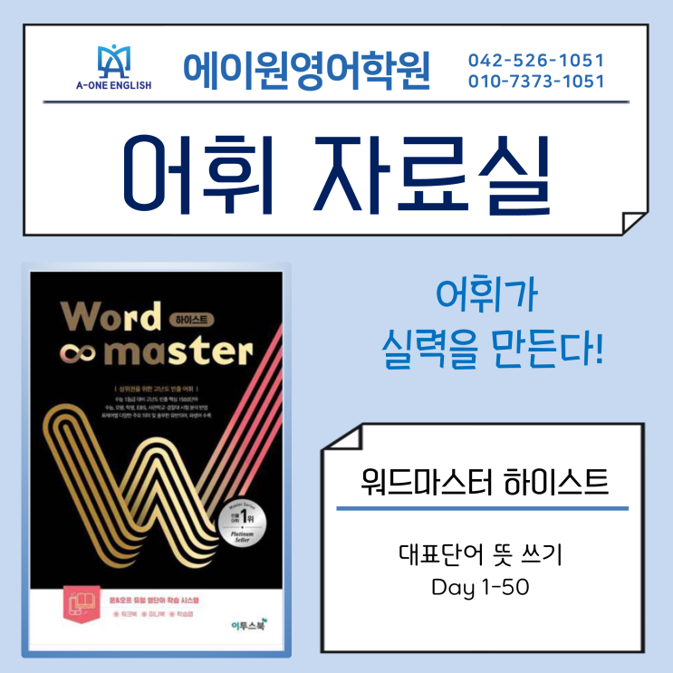 영어 실력의 기본은 결국 어휘! 워드마스터 하이스트 대표단어 뜻 쓰기 Day 1-50 도움이 되셨다면 좋아요부탁드려요 소수정예 ㅣ 밀착관리 ㅣ 책임지도 에이원영어학원 상담 및 문의 042-526-1051 / 010-7373-1051 대전 서구 원도안로207번길 15-3 1층 도안초 정문 맞은편 1층 <img src="https://blogthumb.pstatic.net/MjAyNjAxMDlfMTk4/MDAxNzY3ODkwODk5NTUz.JLs7JdG4U-kvaAKsUmtG396pIQjIdUhtuHErTgAuL-4g.Zihw92836r_8DZ2l-wGcbSHns0NzyEhz7W0M-EXvRW8g.PNG/image.png?type=s3" />
