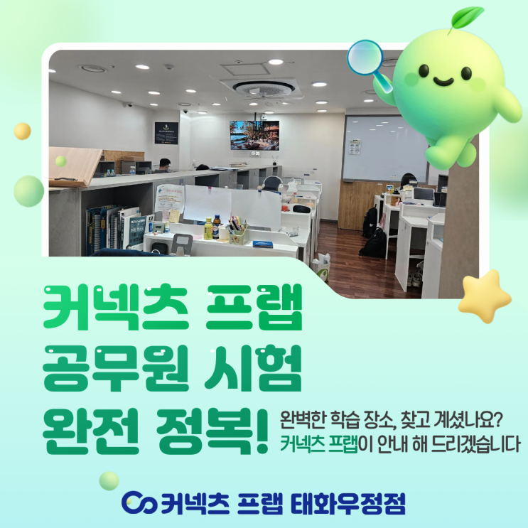 안녕하세요 커넥츠 프랩 태화우정점 입니다! 아침저녁으로 매서운 바람이 불고 있는 지금 커넥츠 프랩에서는 많은 수험생 분들이 공부 하고 있습니다. 국가직, 지방직, 군무원이나 임용고시, 소방, 경찰, 공기업 입사준비, 편입, 회계사, 노무사, 세무사, 수능재수생 까지. 승진시험이나 어학자격증 준비생도 있습니다! 이 많은 시험을 준비하는 수험생 분들이 커넥츠 프랩을 선택한 이유는 뭘까요?! 적지 않은 시간 오로지 합격을 위해 방대한 양의 공부를 해나가야 합니다. 마지막 까지 포기 하지 않고 모든 걸 해내기 위해서는 오로지 학습에 집중하고 몰두 할 수 있어야 하는데, 혼자서 또는 집에서 꾸준한 집중을 해내기는 쉽지 않습니다. 커....... <img src="https://blogthumb.pstatic.net/MjAyNjAxMTZfMjgw/MDAxNzY4NTQ0Mjg3MTg3.X1EoVlYub45RTRK_6ga4qJpS7c1whc3Ru_DJF4uFyD4g.lOWeEpm1CLn3Ebgz55zuYE1R9t7xrBdDSlg430V0pncg.PNG/%C1%A6%B8%F1%C0%BB_%C0%D4%B7%C2%C7%D8%C1%D6%BC%BC%BF%E4._%2832%29.png?type=s3" />