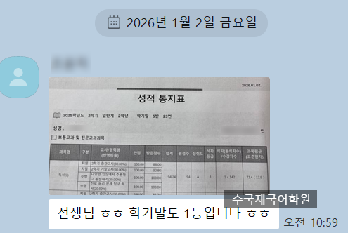 기말고사 성과를 안내합니다 감사합니다 2025년도 수국재와 함께 달려와 주어서 감사합니다 * 2026년도 열심히 파이팅 ^.^ * 학성고2 양0성 1등급 전교1등 우신고2 조0지 1등급 전교1등 무거고1 양0지 1등급 전교1등 학성고2 이0환 1등급 전교2등 학성고2 김0종 1등급 전교3등 호계고1 이0훈 1등급 전교3등 우신고2 양0석 1등급 전교3등 학성고2 김0태 1등급 전교4등 학성고2 최0규 1등급 전교5등 학성고2 이0결 1등급 전교9등 신정고2 김0규 1등급 기말 100점 신정고2 이0현 1등급 학성고1 정0혁 1등급 제일고1 이0민 1등급 범서고1 김0준 중간3등급 → 기말 1등급 무거고1 양0진 1등급 무거고1 김0민 1등급 무거고1 김0주 1등급 강남고1 권0준....... <img src="https://blogthumb.pstatic.net/MjAyNjAxMDJfNjkg/MDAxNzY3MzU5NjY5OTI0.XE0LrjoNPW6UjzHeTDxBxO29hEE3RB4k6G6MBP3fD1Qg.OQ5uspqpLQGRuPFVYVHsyVPi9A5fxa79_iOo7N7vRdsg.PNG/image.png?type=s3" />