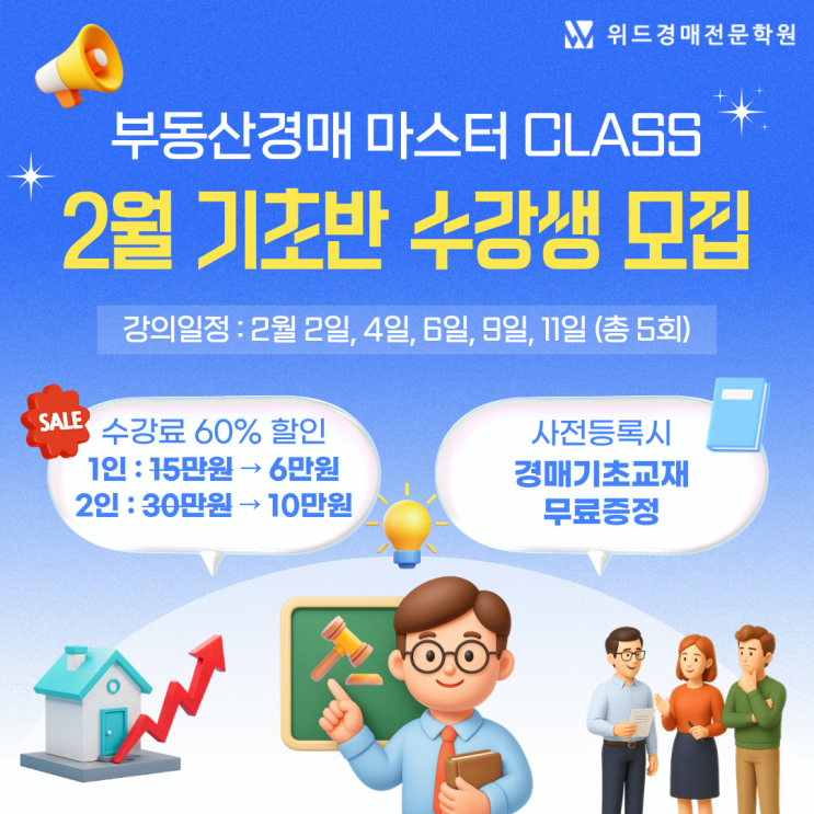 안녕하세요! 부동산경매 제대로 배울 수 있는 위드경매전문학원입니다. 2026년 업그레이드된 위드경매 기초반! "2월 2일 월요일 개강" 부동산경매 MASTER CLASS 기초반 수강생을 모집합니다. 쉽고 빠른 기초반 신청 네이버폼 신청하기 네이버예약 신청하기 2주간 총 5회 수업 (회당 2시간 30분) 첫 수강 혜택 수강료 최대 66% 할인! 다른 학원과는 차별화된 위드만의 5가지 혜택! 2026년에는 부동산 재테크 제대로 시작하셔야죠! 최근 5개월 이내에 기초반을 수강하신 수강생분들의 리얼 후기까지! 부동산, 특히 경매는 책이나 유튜브로만 공부하기에는 어려움이 있는 분야입니다. 저희 위드경....... <img src="https://blogthumb.pstatic.net/MjAyNjAxMDlfNjUg/MDAxNzY3OTU5MzgxNDEy.09j4Pp875E8jR2v2Y31COIcZdVvb6zbq1VJfX9YMfp8g.hfdu0xKJNUSpIPXbJTvCNlXTZv08MWUwPIxFRe09Qpkg.PNG/1.png?type=s3" />