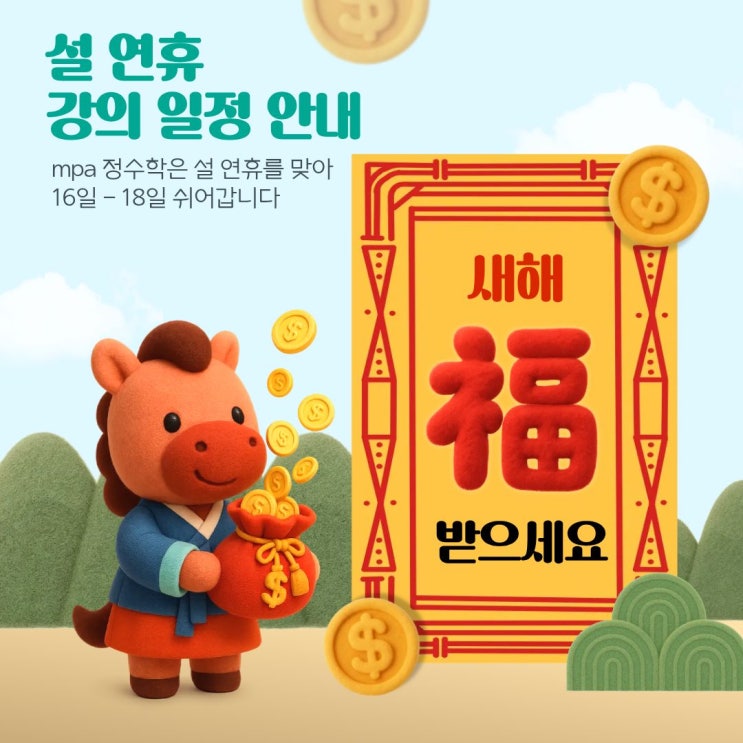안녕하세요 수학, 과학 전문 학원 mpa정수학입니다. 2026년 2월 설날을 맞아 휴강 안내드립니다 2월 16일, 17일, 18일 설 연휴를 맞이해 엠피에이정수학은 쉬어갑니다 19일부터 정상 수업으로 운영됩니다 붉은 말이 힘차게 달리는 2026년 병오년, 그동안 mpa정수학에 보내주신 성원에 감사드리며 학생들과 함께 더 뜨겁게 도전하고 더 크게 성장하는 한 해가 되겠습니다 감사합니다 엠피에이 정수학학원 ☎ 상담문의 02-365-2726 010-2700-2726 [ 초/중 프리미엄관 ] 서울 중구 만리재로 175 402동 402-4-나호 (센트럴자이 상가 4층) [ 고입・대입 입시센터 대흥관 ] 서울특별시 마포구 백범로 124, 2층 (동도중 건너편 S-Oil 주유소) <img src="https://blogthumb.pstatic.net/MjAyNjAyMDlfMjEx/MDAxNzcwNjMyMjk1MzAw.WcI53mtYWcJMHSHzRF4wPVQDSBf2-ffKnEUM3Z8rzlgg.qQpH0LsCjJ3XCjyrFyzjgdR8wQdJ3iia4xqyhCcKRL0g.JPEG/2.jpg?type=s3" />