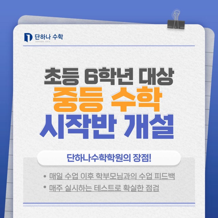 안녕하세요. 단하나수학학원입니다. 2026년 예비 초등학교 6학년 학생 대상의 중학교 과정 수업 개설 안내입니다. 우리 단하나수학학원은 매일 수업 후 학부모님과 그날의 수업에 대해 피드백을 주고 받습니다. 학원에 보내고 나서 상담을 요청하기 부담스럽기도 하고 너무 자주 연락드리면 유난이라고 생각 될까 선뜻 연락하지 못하며 우리 아이가 잘 공부하고 있는지 궁금하실 것 같습니다. 매일 수업 후 간단하게 오늘의 우리 아이가 어떻게 공부하고 있는지 안내드립니다. 학원을 다니면서 반드시 해야할 것은 배운 내용을 정확히 알고 있는지? 혹시 이전에 배운 내용들은 잘 기억하고 있는지 실력을 점검하는 것입니다. 초등학교에서는 중학....... <img src="https://blogthumb.pstatic.net/MjAyNTEyMTFfMzkg/MDAxNzY1NDM3MDA3MzA3.cWSTcdBqV4yfZFihPU2i6YRVz0DbXRKBf2nZEojDgicg.Nkp63CJnGZtp7ZVD3yoBjeHhr1B0hISzVeP_gcUBlFwg.JPEG/1.jpg?type=s3" />