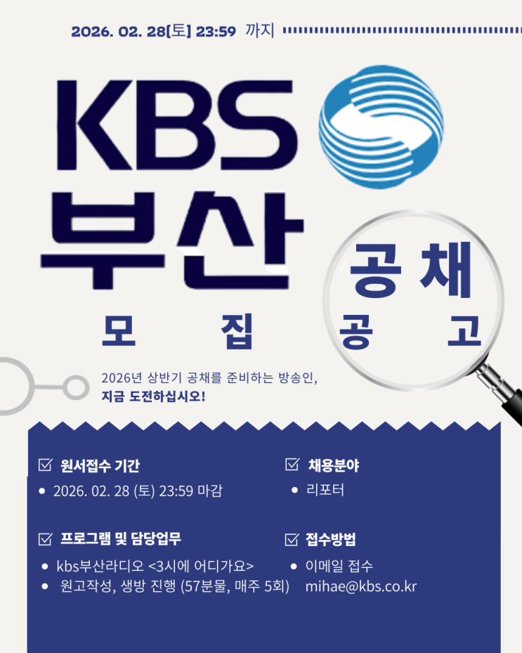 KBS 부산라디오 <3시에 어디가요>에서 2026년을 함께할 리포터를 모집합니다. ◆ 모집인원 : 진행1명 (경력 우대) ◆ 담당업무 : 원고작성, 생방 진행 등 (57분물, 매주 5회) ◆ 업무형태 : 프리랜서 ◆ 근무 지역 : KBS 부산방송총국 ◆ 방송일 : 매일 오후3시 ◆ 채용 절차 : 1차 서류전형, 2차 실무면접 ◆ 급여 : 협의 후 결정 ◆ 근무 기간 : 협의 (협의 완료된 날부터 2026년 12월 31일까지) ◆ 모집기간 : 2025년 2월 13일 ~ 2월 28일 ◆ 제출 서류 : 지원자 자유 이력서, 자기소개서, 포트폴리오 * mihae@kbs.co.kr로 제출 1차 합격자에 한해 무상 카테 및 면접 점검을 진행합니다. J미디어 대표 20년 경력의 김윤정 아나운서의 직....... <img src="https://blogthumb.pstatic.net/MjAyNjAyMjNfMjAw/MDAxNzcxODI5MjI5MzY3.uq-ZwA5DxC76RJraMlf0yc412y0DpD7vDpEGPYNfgTAg.oUFtFijj0WJsvyYo1dv2-AQ7KliUISXWIldRdoLaM4kg.PNG/001.png?type=s3" />