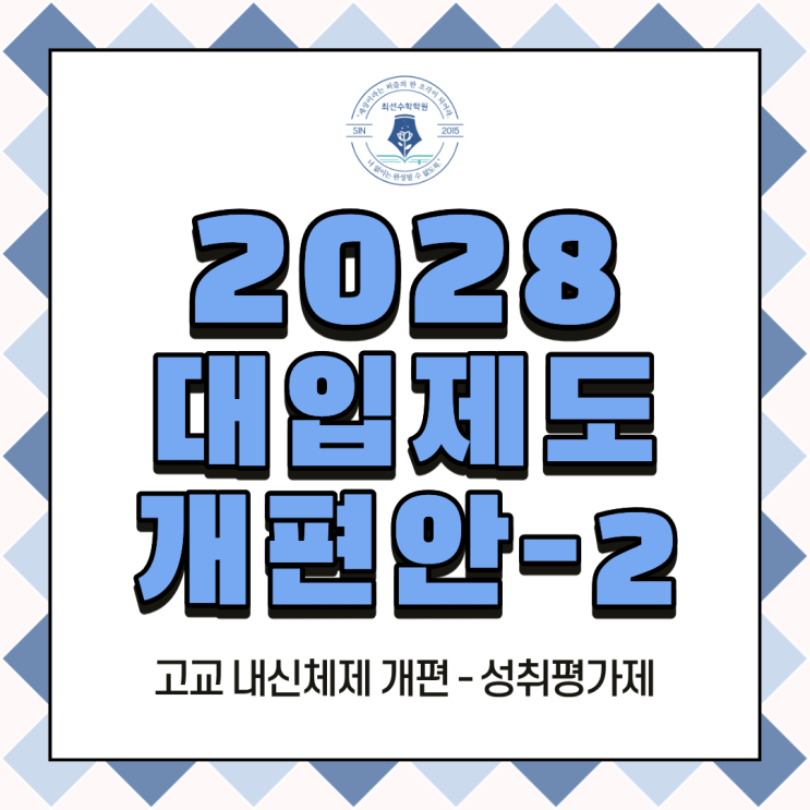 안녕하세요, 최선수학입니다! 오늘은 저번 편에 이어 2028학년도 대입제도 개편안 두 번째 편을 가져왔습니다! 1편에서 2028 대입제도 개편의 큰 방향을 살펴보았다면, 이번 2편에서는 본격적으로 고교 내신 체제 개편 내용을 정리해보겠습니다. 2028 대입 개편의 핵심은 단순히 “시험이 바뀐다”가 아니라, 고교 내신 평가 방식과 학생부 제공 방식이 함께 달라진다는 점입니다. 그럼, 시작해볼까요? 2028학년도 대입제도 개편 ② 고교 내신 체제 개편, 무엇이 달라지나? 1. 성취평가제 도입 배경 2025학년도부터 고교학점제가 전면 적용되면서 학교마다 과목 선택 구조와 이수 체계가 다양해졌습니다. 이러한 상황에서 기존의 상대평가 9등급....... <img src="https://blogthumb.pstatic.net/MjAyNjAyMjRfMjk1/MDAxNzcxOTE3OTIzMzY5.3308kpn5jV4Xt0UNYYKwrQNrgoPKlinjthseA7B3LJEg.6GSg88TBv4D-KYgXrA7pUMB4P1KEjU6Cf3qm8AkyEhgg.PNG/2.png?type=s3" />