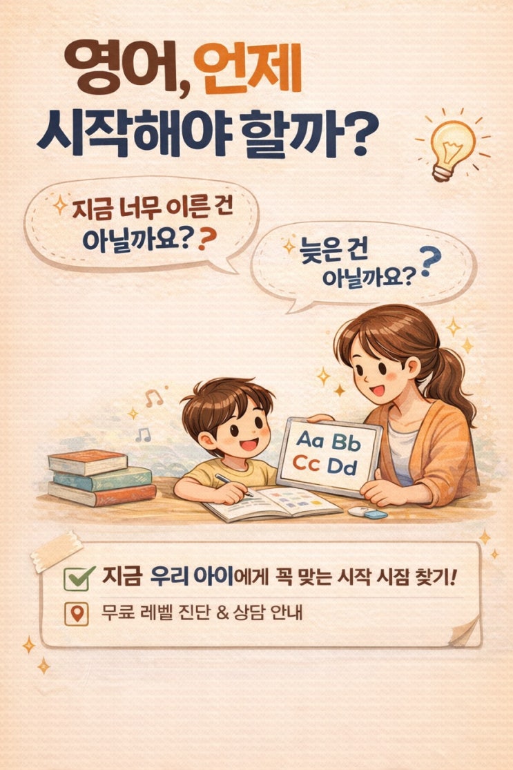 영어 언제 시작해야 하나요? “언제부터 영어를 시켜야 하나요?” “지금 너무 늦은 건 아닐까요?” 이런 고민, 한 번쯤 해보셨죠? 영어는 언제 시작하느냐보다, 어떻게 시작하느냐가 훨씬 중요합니다. 영어 시작, 너무 이른 건 아닐까요? 아이의 발달을 고려하지 않고 너무 이른 시기에 영어를 강요하면 오히려 언어에 대한 거부감이 생길 수 있어요. “영어를 일찍 시작하면 무조건 유리할까요?” 꼭 그렇지만은 않습니다. 아이마다 언어 수용 시기는 다르고, 준비가 안 된 상태에서 시작하면 스트레스로 이어질 수 있어요. 영어 학습의 골든타임은 언제일까요? 영어는 듣기와 말하기가 편안한 시기부터 노출되는 것이 좋습니다. 특히 아이가 소....... <img src="https://blogthumb.pstatic.net/MjAyNjAxMTVfMjQ5/MDAxNzY4NDgxOTU4NDIw.1J64bDUlF1CNrRxwmrtNJQdCNOMr0tOZzrQLqAUgOKIg.FdvH-tr4NjKOgmGEsDuSl1b2x1UWnPdzA8Oszwp26Ekg.JPEG/EFFAE4B9%A3%AD4737%A3%AD4834%A3%AD81C6%A3%ADEAF56C9AFFA2.jpg?type=s3" />