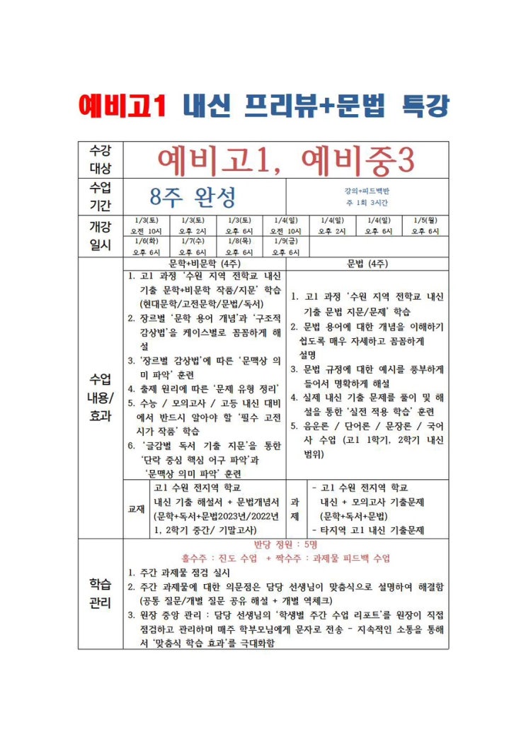 안녕하세요. 수원최강국어학원입니다. (❁´◡`❁) 어느덧 한 해의 마무리를 준비하는 12월이 다가왔네요. 2025년도 열심히 달려오시느라 모두 고생 많으셨습니다! 새로운 한 해의 힘찬 도약을 최강국어학원이 힘차게 응원합니다 :D 지난 11월 30일, 약 스무 분의 학부모님들을 모시고 예비고 설명회를 진행하였습니다. 많은 학부모님들께서 관심을 보여주신 덕분에, 현재 예비고1 수업이 성황리에 진행되고 있습니다 :D 2025년 12월부터 2026년 2월까지 적용되는 최강국어학원의 겨울방학 시간표를 안내드립니다. 시간표에 기재되어 있는 학년은 2026년 진학 예정 학년입니다! (예: 2025년 현재 효원고1 → 토요일 10-13시 효원고2 수업 수....... <img src="https://blogthumb.pstatic.net/MjAyNTEyMTJfMTU4/MDAxNzY1NDk5MzIzNTcy.y35CFfOfifRqMtAqS7QPUhn_Apdx7AjersUpRtp0u5Qg.0M4YXzqR5KgFCM7NcGcXfQjfKPMonQ1u0SXH-YMHhUMg.JPEG/%A1%DA%C3%D6%B0%AD%B1%B9%BE%EE%C7%D0%BF%F8_%BD%C3%B0%A3%C7%A5_%28%B0%DC%BF%EF%B9%E6%C7%D0%29_1.jpg?type=s3" />