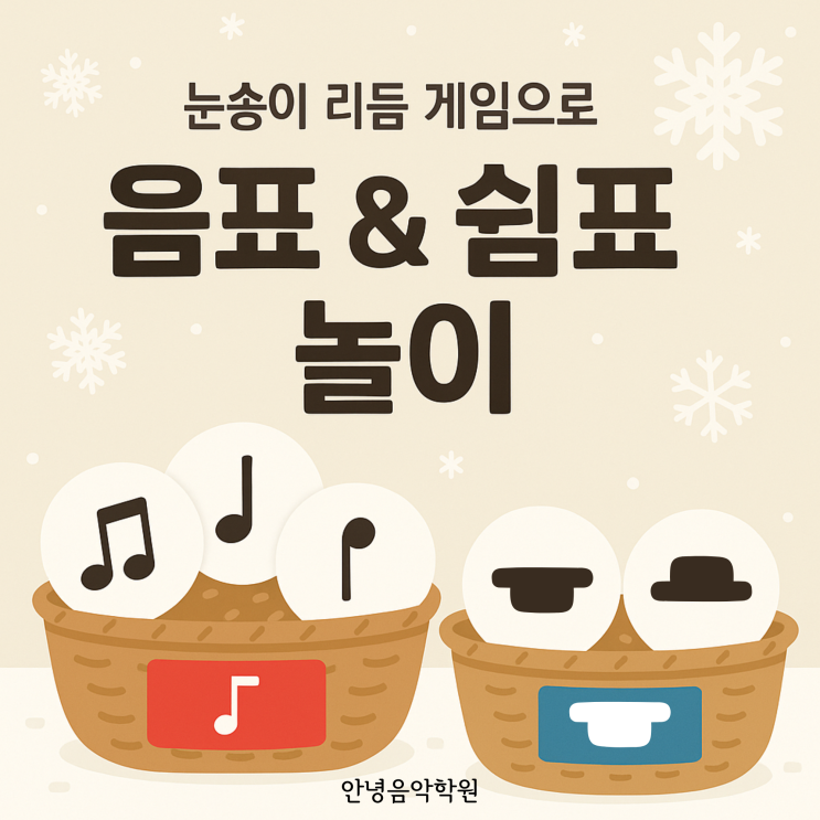 안녕하세요, 안녕음악학원입니다 오늘은 크리스마스를 기다리며 진행한 눈송이 리듬 게임 수업 이야기를 나눠보려 해요 ❄️ 이번 수업에서는 눈송이 모양의 공 하나하나에 8분음표, 4분음표, 2분음표, 온음표 8분쉼표, 4분쉼표, 2분쉼표, 점2분쉼표, 온쉼표 를 직접 그려 준비했어요. “이건 음표야? 쉼표야?” 눈송이를 하나 집어 들고 아이들은 순간적으로 생각합니다. “이건 소리가 나는 음표일까?” “아니면 조용한 쉼표일까?” 그리고 음표 바구니 / 쉼표 바구니 중 어디에 넣어야 할지 스스로 판단해봅니다 ✨ ❄️ 1️⃣ 개인 미션 – 눈송이 5개 도전! 한 명씩 앞으로 나와 눈송이 5개를 차례대로 바구니에 넣....... <img src="https://blogthumb.pstatic.net/MjAyNTEyMTNfMjcy/MDAxNzY1NjM1NjM5MDg0.EB1pz8-9xVoBx8rFITDTZdQehfod37Dv7wuQKHc2O30g.FJZjZ6JW4xsgUnZIRdOBW7YkdGRHel8qTiOhWx7ML9og.PNG/Untitled_%28210_x_210_mm%29.png?type=s3" />