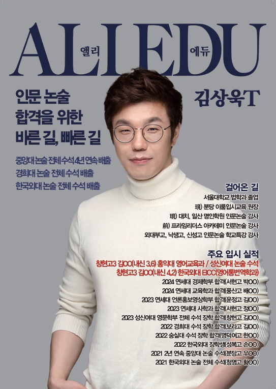 2026년 예비고3 김상욱T 인문논술 간담회 안내 <<인문 논술의 모든 것 & 질의응답>> ★ 수시전형의 또 하나의 히든 카드, 논술전형! 지금 내 성적보다 "2단계 UP"해서 대학가기. 인문논술은 김상욱T가 정답입니다.★ “중앙대 논술 전체 수석 4개년 연속 배출” “경희대 논술 전체 수석 배출” “한국외대 논술 전체 수석 배출” “연세대 논술 합격자 매년 다수 배출” ★★김상욱T의 논술 수업은 강사 "직접" 첨삭이 가능한 인원까지만 반을 구성합니다★★ ▶강사 김상욱T - 서울대 법대 졸업 현) 분당 이룸 입시 교육 원장 (논술 전문) 현) 대치, 일산 명인학원 인문논술 강사 전) 외대부고, 신성고, 낙....... <img src="https://blogthumb.pstatic.net/MjAyNTEyMTdfNTgg/MDAxNzY1OTU1NzM5NDAz.rPou2Dd2Pf5KPgY2IObByTi_mlatrZAOFLbJvZiJgbIg.KVU_9aT9JysscW8ysYBN1NmdoLud74mQD3npmNaDjz8g.JPEG/1217%B1%E8%BB%F3%BF%EDt.jpg?type=s3" />