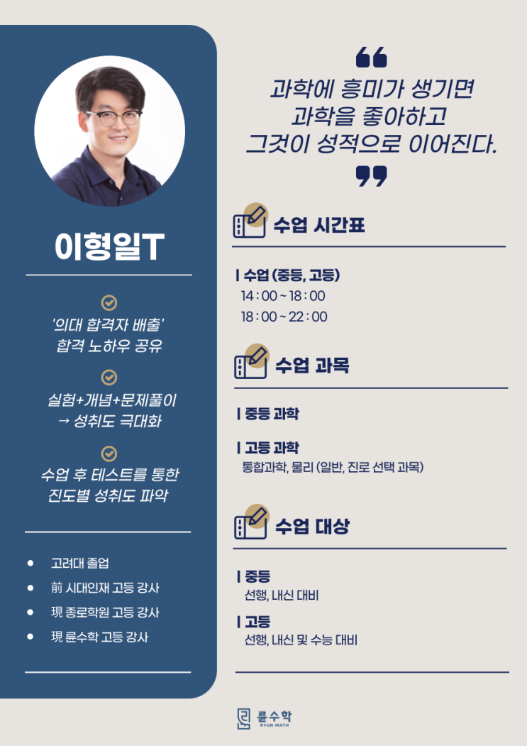 [륜과학 토요일 추가 개강] 수능까지 이어지는 과학 수업|중등과학·통합과학·물리 선행과 내신 완성, 1등급 최상위권에 도달하는 과학 개별맞춤 수업 + 담당 강사 프로필 공개