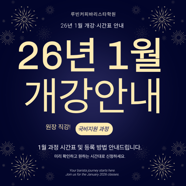 안녕하세요~ 루빈커피바리스타학원입니다. 26년 1월 국비지원 과정 시간표가 확정되어 안내드립니다 이번 26년 1월 과정은 확장이전 후 첫 개강이라 새로워진 공간에서 교육이 진행됩니다. (모란역 2번 출구 1분, 강의실 내부 시창 설치로 방문 시 내부 확인 가능) 먼저 시간표부터 안내드릴게요! 26년 1월 국비지원 과정 시간표 안내 ☕ SCA 바리스타 초급 + 중급 (Foundation + Intermediate) 기초 → 에스프레소 → 라떼아트까지 단계적으로 완성하는 실기중심 과정 화·목 -오전반 (1/6 ~ 2/5) 9:30~13:30 / 총 10회 화·목 -오후반 (1/13 ~ 2/26) 14:30~17:30 / 총 13회 월·수·금 -저녁반 (1/5 ~ 2/2) 19:00~22:00 / 총 13....... <img src="https://blogthumb.pstatic.net/MjAyNTExMjJfMjQ2/MDAxNzYzNzkwNjc0MDU0.ti09SDyAaK5ESL2XjJKFkXQ9N5lhiasg_zqoBo_Vl1Qg.q9b9IJllTK-B1sUfiBDzBcTpizDRRhlr_AXKl2l-XBMg.PNG/1%BF%F9%B0%B3%B0%AD.png?type=s3" />