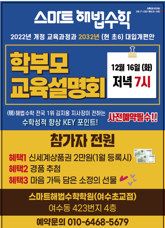 스마트해법수학학원 12월 16일(화) 학부모 설명회 안내 — 2032 대입개편안 & 수학성적 향상 KEY 포인트 — 안녕하세요, 스마트해법수학학원 원장입니다 이번 12월 16일(화)에는 재원생은 물론, 신규 학부모님들께도 꼭 필요한 설명회를 준비했습니다. 최근 많은 학부모님들이 “앞으로 대입이 어떻게 바뀌나요?” “지금 초등·중학생은 어떤 준비를 해야 하나요?” “수학을 어떻게 해야 흔들리지 않나요?” 라는 고민을 가지고 계십니다. 이번 설명회는 이런 궁금증을 한 번에, 확실하게 해결해 드리기 위해 마련되었습니다. 1. 무엇이 달라지는가? — 2032 대입 개편 핵심 안내 2032학년도 대입은 현 초6 이하 학생들이 처....... <img src="https://blogthumb.pstatic.net/MjAyNTExMzBfMjE4/MDAxNzY0NTEzNTAwNzkw.NvgP79iRH925olWPIBMEej8g9xzygVI9ZEJ8_FH6Iicg.Dq-xtOTQSlzKWlDdhFTrovnwGffVUfV17bD7CRaB_dEg.PNG/%C7%D0%BA%CE%B8%F0%BC%B3%B8%ED%C8%B8.png?type=s3" />