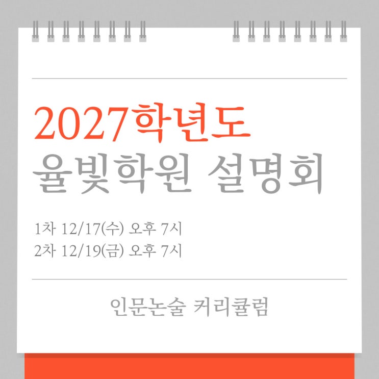 안녕하세요, 분당 논술 학종 전문 율빛학원입니다. 이번 주말에 26학년도 논술 시험이 모두 마무리됩니다. 열심히 달려온 학생들에게는 12월이 결실의 달이 되길, 내년에 입시를 치르는 학생들에게는 힘찬 시작의 달이 되길 바랍니다. 1년이라는 길고도 짧은 마라톤 속 페이스메이커 또는 단단한 성장을 위한 발판이 되고자, 율빛학원이 26학년도 논술 입시설명회로 한 해의 시작을 알립니다! 이번 설명회는 2회차로 나눠서 진행합니다. 동일 내용으로 진행되니 편하신 일정으로 선택하여 신청해주시면 됩니다. 선착순 신청으로 조기 마감될 수 있음을 양해부탁드립니다. *신청 방법은 글 하단에 나와있습니다. 설명회 일시 1차 설명회 : 12/17(수....... <img src="https://blogthumb.pstatic.net/MjAyNTExMjZfMjEz/MDAxNzY0MTMwNTk2NDk3.7SrZxIjn4NlX4wlj_7P1lEn7-rT6hkRR_1l5mB9kwdYg.Wdhih5HLF0C3qmpoDpslxnpsq0mt32zGW2NUEM1rdUYg.JPEG/%C1%A6%B8%F1%C0%BB-%C0%D4%B7%C2%C7%D8%C1%D6%BC%BC%BF%E4_-001_%2823%29.jpg?type=s3" />