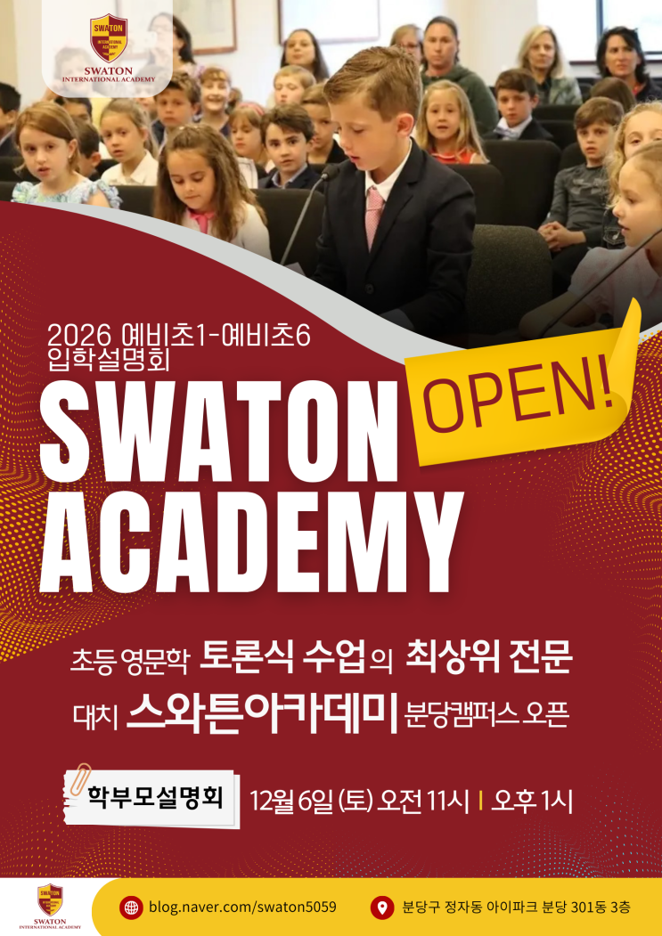 안녕하세요, 프라우드7어학원 재단의 최상위 레벨, 대치 Swaton International Academy가 2026년 분당 프라우드7의 상위 레벨로 공식 오픈합니다! 대치에서만 제공되던 최상위 레벨의 교육 기준과 커리큘럼이 처음으로 분당에 상륙하는 순간입니다. Swaton의 프리미엄 토론식 영문학 교육을 분당 지역에서 펼칠 수 있다는 그 자체로 큰 의미와 가치를 갖습니다. 이에 분당 지역 학부모님들을 모시고 Swaton만의 차별화된 프로그램과 커리큘럼을 소개해드릴 설명회를 12월6일 오전11시/ 오후1시 진행합니다. ▶대상: 2026학년도 예비초1학년~예비초6학년 ▶일시: 12월6일 토요일 오전11시/오후1시 ▶장소: 프라우드7어학원 분당브랜치 이번 설명회....... <img src="https://blogthumb.pstatic.net/MjAyNTExMjZfMjM2/MDAxNzY0MTYzMjU2MjE0.I2MHPtQBkvYBD_M0Qur3qhJutTpOfrOi29MYCU2mEBsg.MLMZfny5sPb0ScWiwTdo32HHw3AY1w0xaE_G6hYUhrUg.PNG/Swaton_1.png?type=s3" />