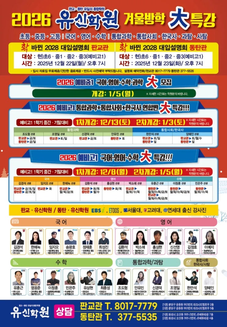 동탄 유신학원 2026학년도 예비고1 ☆1.2등급☆ 달성을 위한 통과ㆍ통사ㆍ한국사 연합반 12월개강 안내