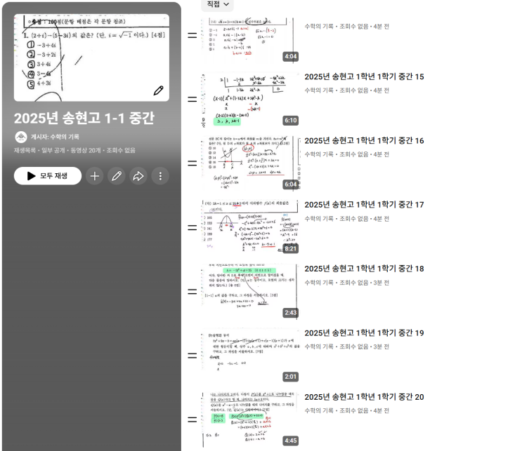 민락2지구에 위치한 수학 단과학원 '수학의기록' 입니다. [송현고 수학학원!] 지난번엔 영석고 기출을 작업해봤는데요~ 이번엔 송현고 [수학] 1학년 1학기 중간고사 기출문제 전문항을 꼼꼼하게 녹화하였습니다. 전문항을 하나하나 개별녹화하고 업로드 하여 학생들이 원하는 문제만 쉽고 빠르게 언제든지 시청할 수 있도록 하였습니다. [생각보다 오래 걸리다보니 시험기간이 아닐 때 미리미리 작업하고 있습니다..] 기출문제 풀이는 수학의기록 재원생에게만 별도 링크로 제공하고 있습니다. 송현고 2025년 1학년 1학기 중간고사는 객관식 17문제, 논술형3문제로 출제되었습니다. 1번~10번 문항 교과서의 기본 문제 수준으로 어렵지....... <img src="https://blogthumb.pstatic.net/MjAyNjAyMjBfMzMg/MDAxNzcxNTE2Mjk2OTUw.fa2UOwACK-qIal-NXDQG2xMZLZlQ99njDRO8NBkGweIg.oS6qOfoI7xsePWzuzkNx3c3JVfSjpioXWOXyKM_l3Hcg.PNG/image.png?type=s3" />