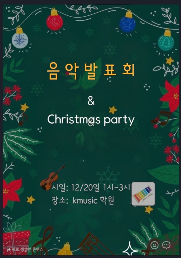 크리스마스 파티 진행합니다^^ 이번주 토요일 음악놀이 선생님과 함께 음악이론과 함께하는 크리스마스 파티 진행합니다^^ 준비물과 간식도 준비하고자 하니 문자 남겨주세요^^ (재료비가 있어서 15000원 참가료 받습니다^^) 010.9147.2093 <img src="https://blogthumb.pstatic.net/MjAyNTEyMTdfMjg0/MDAxNzY1OTY0NzE1NDIx.JvhzU4JBzKjbD6JiZYpZcm08JeqSWUwtTQs8gKgE09kg.Qs6SD39parz4s5EcFiq71Ljn8KOqAm5mhJgqe3tf35Ag.JPEG/900%A3%DFScreenshot%A3%DF20251217%A3%DF124932%A3%DFBAND.jpg?type=s3" />