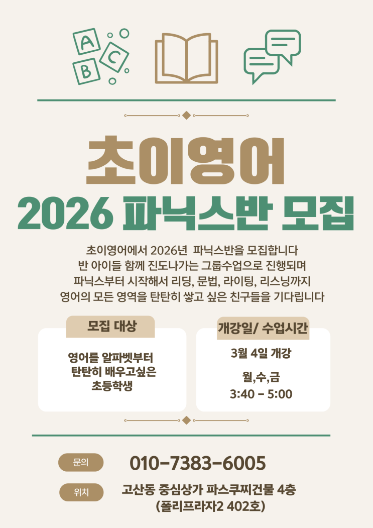 안녕하세요 고산동 영어내신전문! 초이영어입니다 :) 2026년의 처음이자 마지막 초이영어 파닉스반의 개강을 알려드립니다 벌써 초이영어 파닉스반 문의가 정말 많습니다 :) 개강날짜는 3월 4일이고 월수금 주3회 공부하는 반으로 시간은 3:40-5:00 80분 수업으로 진행됩니다! 수업내용에 대해 궁금하신 점이 있으시면 문자 남겨주시거나 전화주세요 초이 파닉스수업내용은 아래 블로그 글을 확인해주세요! https://m.blog.naver.com/choiienglish/223331515212 감사합니다 <img src="https://blogthumb.pstatic.net/MjAyNTEyMTBfMjYy/MDAxNzY1MzYzNTc0NTQ3.E7xLEjEdncHjGYuODm_VNDY6OWMWTZRauCHW9U_ZblYg.sBI_spwHLjHkjAccHCChciPy-WH0wQCDf8mAKMWjNBMg.PNG/%BA%A3%C0%CC%C1%F6%BB%F6_%B9%E8%B0%E6_%BF%B5%BE%EE_%BE%C6%C0%CC%C4%DC_%BF%B5%BE%EE%C7%D0%BF%F8_%C8%AB%BA%B8_%C0%FC%B4%DC%C1%F6.png?type=s3" />