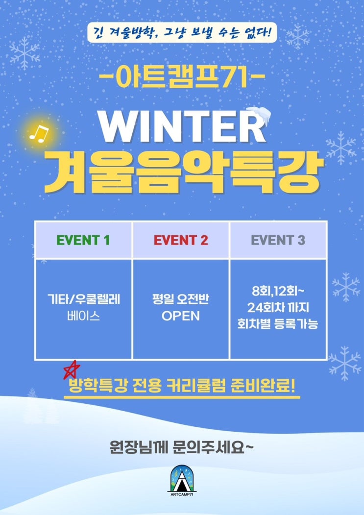 #의정부기타학원 #겨울방학특강 #우쿨렐레 긴 겨울방학, 우리 아이 특기 하나 만들어줄 기회! 안녕하세요, 아트캠프71 의정부민락점입니다. 길고 긴 겨울방학을 앞두고 우리 아이들이 그냥 시간을 흘려보낼까 봐 걱정하는 학부모님들이 많으시죠? 특히 요즘 학생들은 악기 하나쯤은 기본으로 다룰 줄 알아야 하는 분위기라서 더 신경이 쓰이실 것 같아요. 아이들을 가르치는 입장에서, 방학만큼 집중적으로 실력을 올릴 수 있는 기회는 없다고 생각하는데요. 그래서 저희 아트캠프71 의정부민락점에서 알찬 겨울방학 음악 특강을 준비했습니다! 기타, 우쿨렐레를 단기간에 확실하게 배울 수 있도록 특강 전용 커리큘럼을 준비했어요. 곡....... <img src="https://blogthumb.pstatic.net/MjAyNTEyMTNfMjIy/MDAxNzY1NTU0MTU0OTU3.kqfpFemRRYQDW1y8l1XQazdr8jGcpKBmM8K6GC5md2Mg.8oPjeBGCwfJdWwgh7ntGVsw7qsyDEuicrTP7SgKQuEog.JPEG/A2%A3%AD%C6%F7%BD%BA%C5%CD_%A3%A85%A3%A9.jpg?type=s3" />
