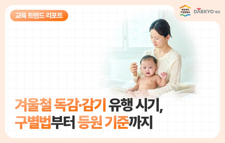 요즘 독감과 감기가 유행하고 있죠. 특히 어린이집과 학교처럼 아이들이 함께 지내는 공간에서 확산 속도가 빨라지면서 부모들의 걱정도 커지고 있습니다. 우리 아이의 건강을 지키기 위해 독감과 감기의 차이, 아이에게 나타나는 주요 증상, 어린이집 등원 기준을 함께 살펴보겠습니다. 감기는 리노·아데노·코로나바이러스 등 다양한 바이러스에 의해 발생하며, 콧물·코막힘·인후통이 서서히 시작되는 것이 특징입니다. 대부분 미열 또는 열이 없고 7~10일 이내 자연 회복되는 경우가 많습니다. 반면 독감(인플루엔자) 은 A·B형 인플루엔자 바이러스가 원인으로, 1~4일 잠복기를 거쳐 38도 이상 고열, 근육통·두통·오한이 갑자기 나타납니다. 소....... <img src="https://blogthumb.pstatic.net/MjAyNTEyMTVfODcg/MDAxNzY1Nzc2Nzg5MDMw.IOrPs_M5MH_xpAewZJH--zpi_Ptc3uCt00guF1JoSSQg.rQnXLCIQ2FDfCU1rWt8MhNbjUBkggb45V6ziyME6clkg.JPEG/1_1_%2818%29.jpg?type=s3" />