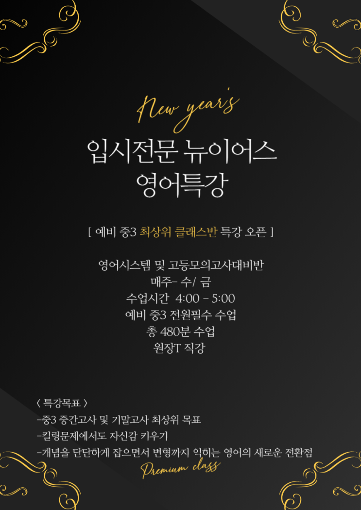 예비중3 겨울방학, 고등영어로 넘어가기 전 가장 중요한 전환기를 어떻게 준비해야 할까요? 이번 뉴이어스 입시전문 영어특강은 단순한 문제풀이 수업이 아닌, ☑️ 문장 구조 이해 ☑️ 영어 문장 시스템 학습 ☑️ 영작 기반 사고력 훈련 ☑️ 고교 모의고사 유형 선행 중심으로 구성된 입시형 영어 시스템 수업입니다. 이번 영어겨울방학특강 핵심은 ✔ 문장 구조 이해력 ✔ 논리적 해석력 ✔ 스스로 문장을 만들기 능력 이번 특강은 영어문장구조 이해 → 시스템적용 → 영작 흐름으로 진행되어, 학생들이 단순히 맞고 틀리는 영어가 아니라 암기보다는 이해도 UP 영어시스템 이용하여 스스로 고쳐 쓸 수 있는 영어 실력을 만....... <img src="https://blogthumb.pstatic.net/MjAyNjAxMjNfMjU2/MDAxNzY5MTM3NDc1MzI4.RpkxKgb4NEkMU9tLhc7AZiT5mo_ZJ3sukwO196u1xdwg.CXMKj9jysreQvcT2ggp1r6thjorAqJ5naTiQUIgzhyYg.PNG/IMG%A3%DF4612.PNG?type=s3" />