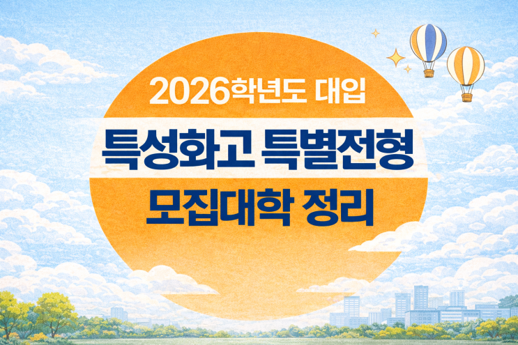 2026학년도 대입 특성화고 특별전형 한눈에 정리 1. 특성화고 특별전형이란? 특성화고 특별전형은 국내 특성화고등학교 졸업(예정)자를 대상으로, 일반고 학생과 분리하여 선발하는 수시 중심 전형이다. 2026학년도 대입 기준, 특성화고 특별전형은 4년제 대학 기준 총 3,056명을 모집하며, 이는 2025학년도(3,215명) 대비 159명 감소한 수치다 2. 2026학년도 모집 규모의 특징 전체 모집인원: 3,056명 수시 모집인원: 2,475명 수시 비중: 81% 전체 모집인원은 줄었지만, 수도권 대학의 수시 모집인원은 오히려 증가했다는 점이 특징이다. 2026학년도 수도권 대학의 특성화고 특별전형 수시 모집인원은 609명으로, 2025학년도(580명)보다 29명 증....... <img src="https://blogthumb.pstatic.net/MjAyNjAxMjNfNzQg/MDAxNzY5MTUzMDYzNjM2.5k-Puze0jPK4bk44dk58iZTs34tYjQbRgB5w6O7muzcg.EqfvrlLXbuM2QubB7yVdKn-8828AtflbuCyCTenBVtYg.PNG/%C6%AF%BC%BA%C8%AD%B0%ED%C6%AF%BA%B0%C0%FC%C7%FC%B4%EB%C7%D0.png?type=s3" />