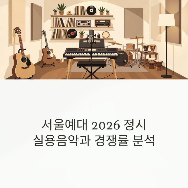 실용음악 전공, 어떤 파트가 가장 치열했을까? 서울예술대학교 실용음악과의 2026학년도 정시 최종 경쟁률이 공개되었습니다. 노래, 작곡, 연주 등 다양한 세부전공별로 경쟁률 편차가 컸으며, 특히 보컬 분야에서 압도적인 경쟁률을 보이며 많은 지원자들의 관심을 확인할 수 있었습니다. 이번 글에서는 전공별 경쟁률과 특징을 자세히 분석해드립니다. 보컬 전공, 남녀 모두 치열한 경쟁률 보여 보컬 전공에서는 여자가 277.5:1, 남자가 182.5:1 이라는 놀라운 경쟁률을 기록했습니다. 특히 노래(여)는 전체 실용음악과 세부전공 중 경쟁률 1위를 차지하며, 서울예대 입시에서 여전히 보컬 전공이 가장 인기 있다는 것을 증명했죠. 실제로 노래....... <img src="https://blogthumb.pstatic.net/MjAyNjAxMjZfMjQz/MDAxNzY5NDI0ODU0NDY0.pGrq61MX89MVCXeaTG48QFWUodHq84Nx-wG72MA4HPcg.7BcpwDzsi-X5fTXoDxhy6RE_2TYX4hjQI4KzTOsoVlMg.PNG/1_2026.png?type=s3" />
