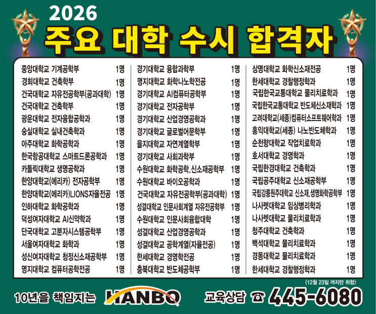 많은 아쉬움을 남기며 2026학년도 대입 수시 합격자 발표가 끝났습니다. 대입이라는 목표를 세우고 오랜 시간동안 정진해왔던 학생 여러분 정말 수고 많았습니다. 결과를 떠나서 긴 시간동안 힘든 교육과정을 이수하고 대입이라는 큰 산을 넘기위해 고통과 번민 자기와의 싸움들을 이겨낸 여러분들에게 온 마음을 다해 박수를 보냅니다. 정말 수고 하셨습니다. 고등과정을 마친 여러분! 대학 입학으로 이제 여러분들은 더 넓은 세상을 향한 첫 걸음을 내 디딜것입니다 지금까지 쌓아온 노력들은 앞으로 여러분의 선택을 믿게 해 줄 가장 큰 힘이 될 것입니다. 여러분의 다음 발걸음을 기대합니다. 미래를 두려워 하지 말고 기대하십시오 한보학원....... <img src="https://blogthumb.pstatic.net/MjAyNjAxMjdfMTIg/MDAxNzY5NTA1NDMxNjA0.eNAmCHeYbK1JL-vj7xlgSiEovtHTHEA0i2b0HMlOwwsg._MAin579nMfKTbiOMCqc2QZwUPSaUEEod7818wPXe_Yg.PNG/2026%B3%E2_%B4%EB%C0%D4%C7%D5%B0%DD%C0%DA_3%C4%B7%BF%EB.png?type=s3" />
