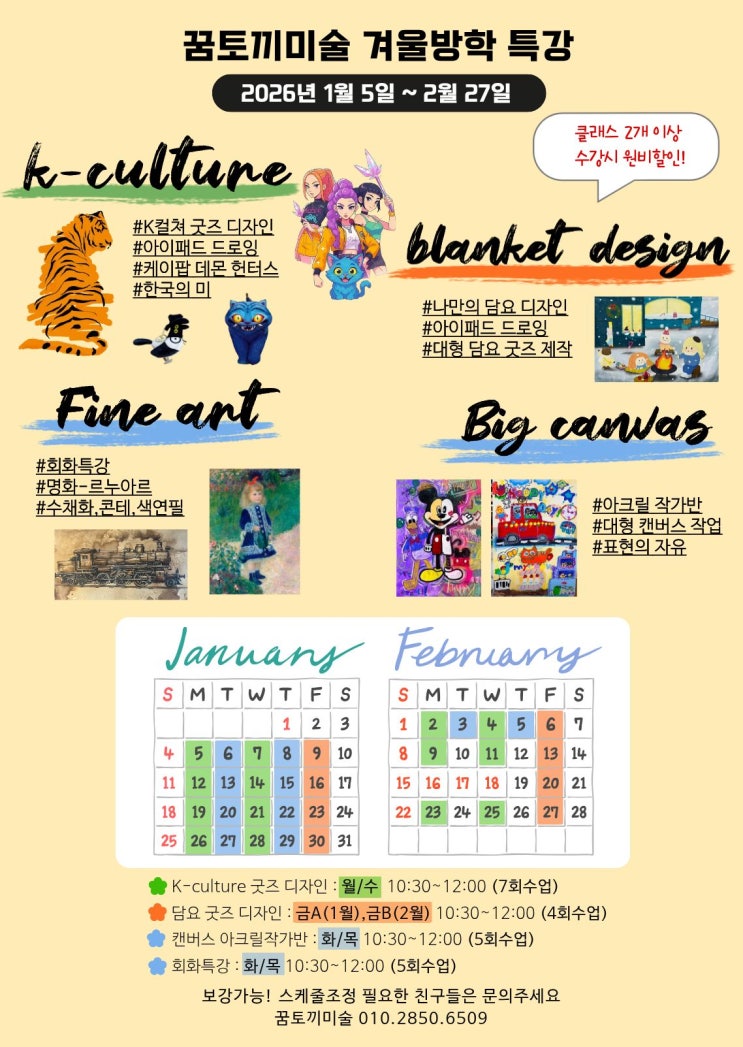 안녕하세요 꿈토끼 미술입니다 긴 겨울 방학기간동안 아이들이 깊이있는 예술세계를 경험 할 수 있는 특별한 수업들을 준비하였습니다! 벌써부터 방학특강 수업 문의주시는 분들이 계시는데요, 저희 방학특강 수업은 매년 마감될 정도로 인기가 많으니 관심있는 친구들은 빠르게 신청주세요^^ 수업 스케줄 조정이 필요한 친구들은 개별적으로 문의바랍니다! <img src="https://blogthumb.pstatic.net/MjAyNTExMjZfMjM2/MDAxNzY0MTUxMTkwNTM0.3cRehnTPpqAaXpSG7JInnhTjrsbAubC_p87Dl3-u0s4g.bPHJisCsiXNDD2BwX3MRE4_cZd-PVc5D3bYd8YKqcn8g.JPEG/1.jpg?type=s3" />